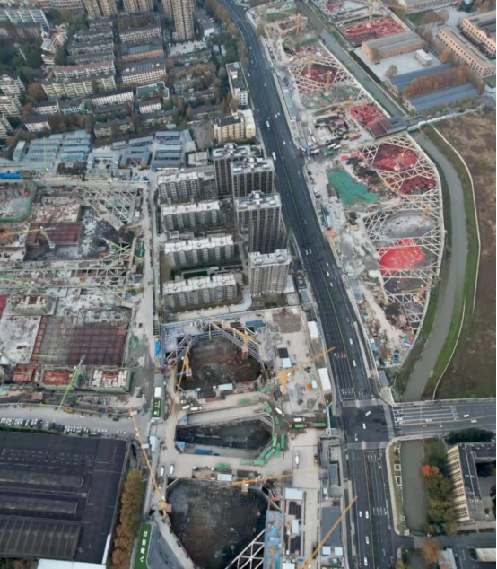 嘉里基坑群共5个地块,4个基坑及6个连通道工程,住宅区基坑占地面积5.5万平米,开挖深度10~15m,商业区基坑占地面积2.5万平米,设四层地下室,开挖深度22m,紧邻地铁5号线,深厚淤泥质软土地层对周边环境保护要求高。本项目创新性采用螺旋式下基坑栈桥结合高栈桥平台及项目部,快速出土保证围护微变形。